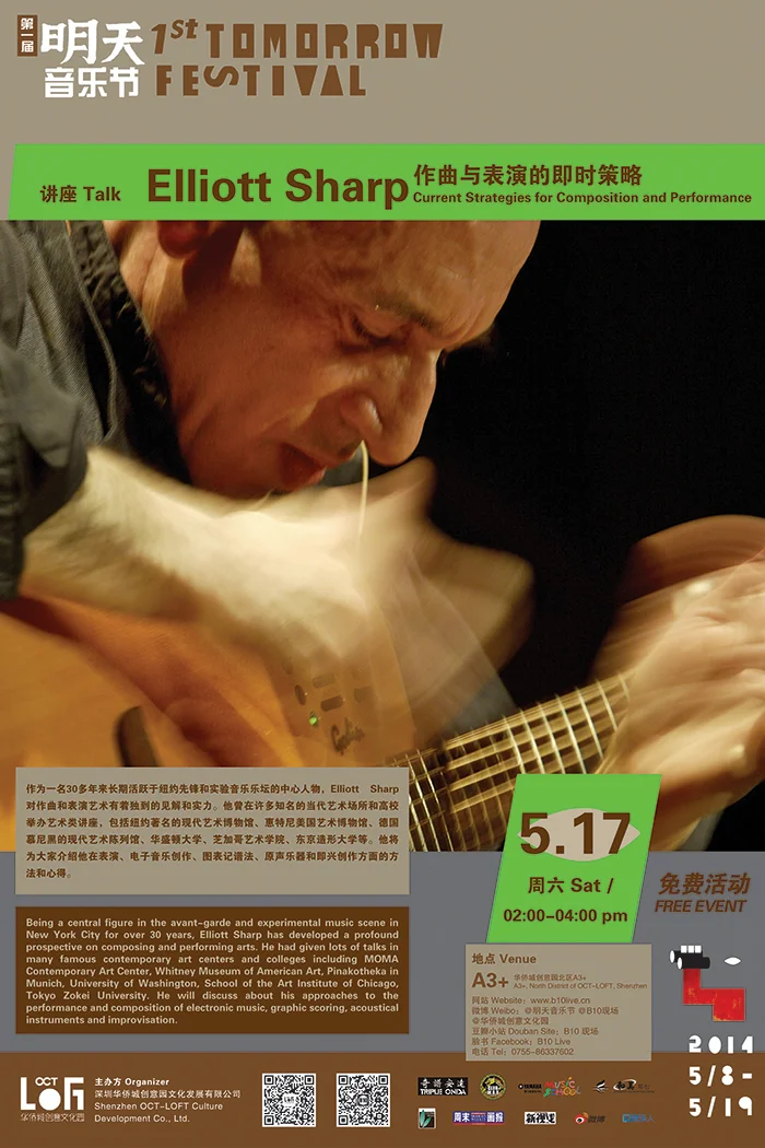 作为一名30多年来长期活跃于纽约先锋和实验音乐乐坛的中心人物,Elliott Sharp对作曲和表演艺术有着独到的见解和实力。他曾在许多知名的当代艺术场所和高校举办艺术类讲座,包括纽约著名的现代艺术博物馆(MOMA Contemporary Art Center)、惠特尼美国艺术博物馆(Whitney Museum of American Art)、德国慕尼黑的现代艺术陈列馆(Pinakotheka)、华盛顿大学(University of Washington)、芝加哥艺术学院(School of the Art Institute of Chicago)、东京造形大学(Tokyo Zokei University)等。他将为大家介绍他在表演、电子音乐创作、图表记谱法、原声乐器和即兴创作方面的方法和心得。